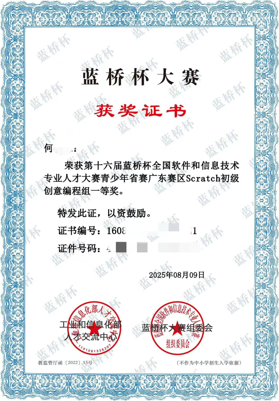 付出终见回响。在不久后的一系列编程赛事中,何同学凭借扎实的基础与充满想象力的创作一路闯关。在全国青少年信息素养大赛阶段,他以逻辑清晰、创意独特的作品获得了省级一等奖及二等奖;紧接着的在蓝桥杯省赛上,他沉着应对、灵活发挥,再次斩获荣获一等奖。这些*,不仅是对他过去一年努力的*好见证,更让他从中学会了坚持、学会了思考,也愈发坚定了一个信念:只要心怀热爱,就能在编程的世界里,走得更远、突破更多。