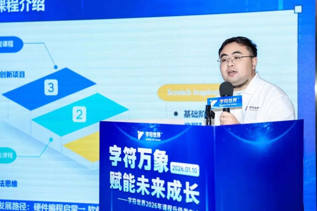 随后,字符世界品牌创始人卞烽懿老师登台致辞。他回顾了机构以“赋能未来”为核心的创业初心,并强调:在AI重构世界的今天,编程思维已成为新一代的基础生存技能。字符世界的使命,正是通过科学、专业的课程体系,赋予孩子面向未来的核心胜任力。